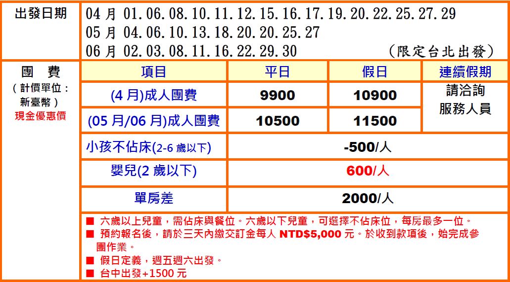 | 雙人套房 | 依出發日期價格以準/人 | 依出發日期價格以準/人 | 依出發日期價格以準/人 |
