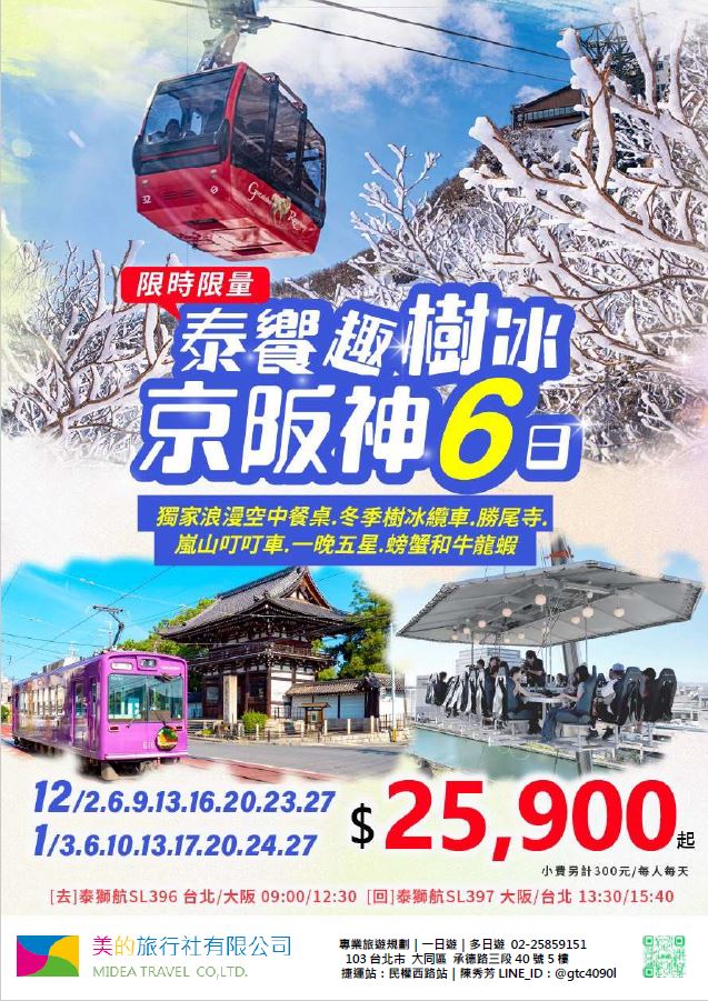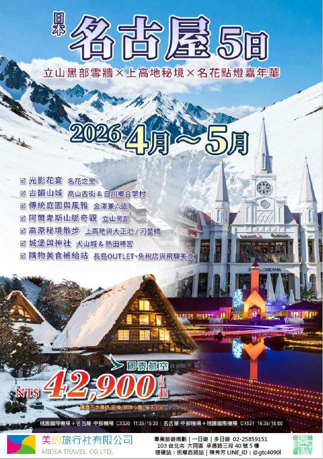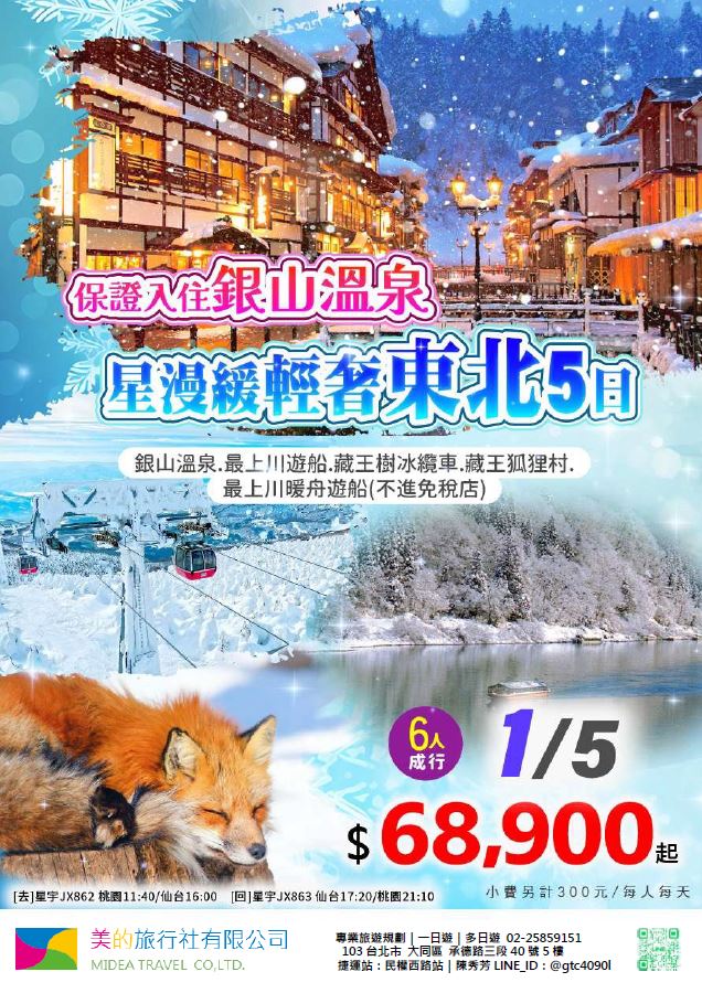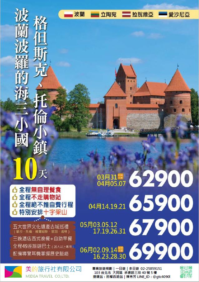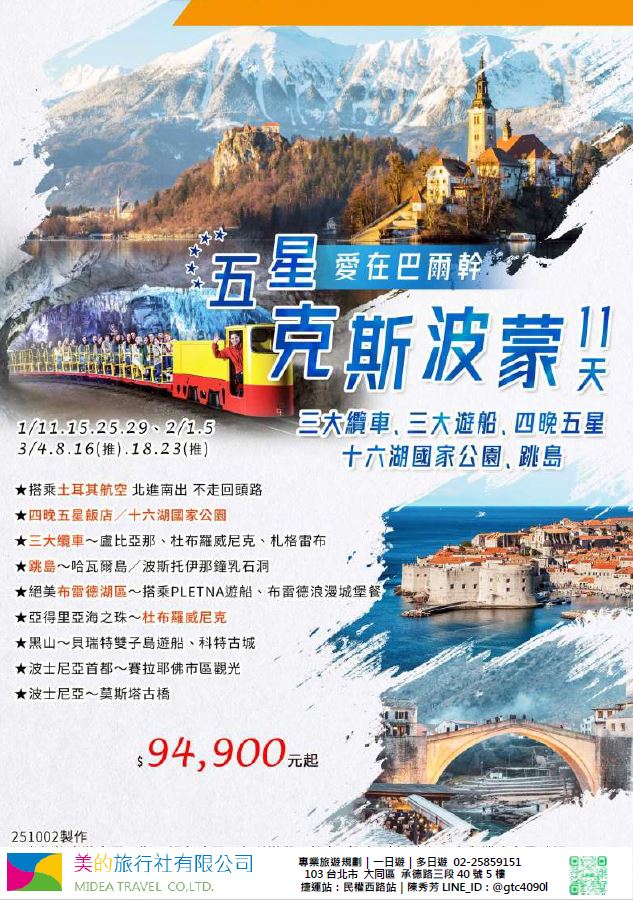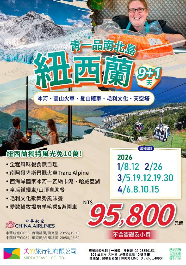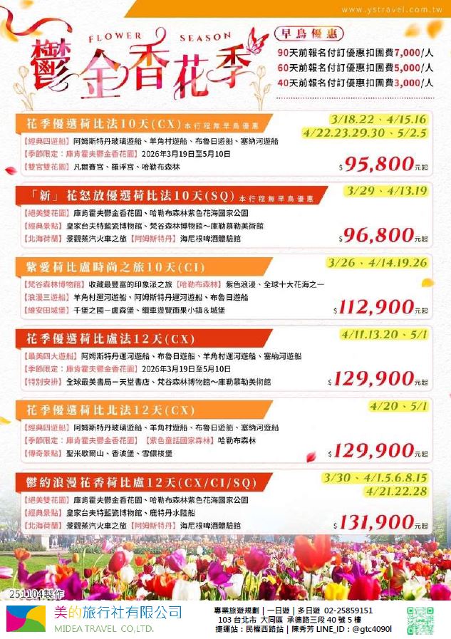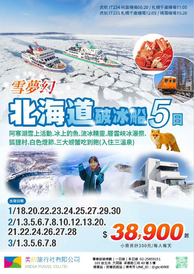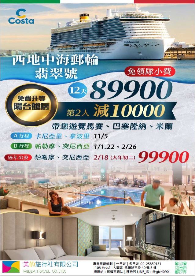 | | 地區/國家 | 行程 | 出發日期 | 價格 | 早島優惠 | | 東南亞 | 新吉橙全覽10天 | 2/10 | 51900 | 第2人減1萬 | | | 尊爵馬新6天 | 2/12 | 37900 | 第2人減5千 | | | | 2/19,2/17,2/14,2/16 | 39900/43900/45900 | | | | 尊爵吉隆坡6天 | 2/13,2/19,2/14-16,2/17 | 39900/43900/45900 | 第2人減5千 | | | 沙巴6天 | 2/13,2/19,2/14-16,2/17 | 45900/47900/49900 | 升五星芙2晚+1自助餐 | | | 古晉+汶萊8天 | 2/8 | 39900 | | | | 泗水+汶萊8天 | 2/8 | 39900 | | | | 樂活泰國6天 | 2/18,2/19 | 33900 | 第2人減5千*候補* | | | 精彩曼谷6天 | 2/18,2/19 | 43900/39900 | 第2人減5千 | | | 星宇精彩曼谷5天 | 2/13 | 43900 | 第2人減1萬 | | | 豪華清邁6天 | 2/12 | 39900 | | | | | 2/19 | 43900 | | | | 清邁+曼谷10天 | 2/13 | 55900 | 第2人減1萬 | | | 星宇河內5天 | 2/16,2/18 | 43900 | 第2人減5千 | | | 吉婆島全覽8天 | 2/9 | 33900 | | | | 精彩富國島6天 | 2/13,2/15,2/19 | 42900/47900/39900 | | | 韓國 | 可依首爾滑雪5天 | 2/14 | 35900 | | | | 易斯達首爾滑雪6天 | 2/18 | 37900 | *候補* | | | 濟州樂園5天 | 2/15 | 37900 | 第2人減5仟 | | | 濟州超值5天 | 2/18 | 29900 | | | | 尊爵濟州5天 | 2/14 | 36900 | 第2人減5仟 | | | 釜山滑雪5天 | 2/16 | 38900 | *餘1席* | | | | 2/19,2/20 | 29900 | | | | | 2/17 | 36900 | *候補* | | 日本 | 東京樹冰5天 | 2/12 | 49900 | *午班機* | | | | 2/16 | 59900 | | | | | 2/18 | 60900 | *午班機* | | | 大阪玩雪5天 | 2/11 | 44900 | *泰越捷* | | | | 2/13 | 49900 | *泰越捷* | | | | 2/13 | 48900 | *亞航* | | | 大阪雙樂園5天 | 2/17 | 54900 | *售完* | | | 豪華沖繩5天 | 2/11 | 35900 | *泰越捷* | | | | 2/16 | 45900 | *泰越捷* | | | 沖繩渡假村5天 | 2/18 | 51900 | *泰越捷* | | | 豪華沖繩4天 | 2/15,2/16 | 39900 | *泰越捷2/15/亞航2/16* | | | | 2/20 | 27900 | *亞航2/20* | | | 山陰山陽8天 | 2/2,2/16 | 51900 | *亞航2/16過年69900* | | | 北海道破冰船6天 | 2/11 | 49900 | *名額餘1* | | | | 2/13,2/18 | 65900 | | | | | 2/16 | 69900 | | | 歐州長線 | 土耳其10天 | 2/10 | 49900 | *松山回* | | | 土耳其15天 | 2/14,2/20 | 89900 | *早班機*2/14餘2 | | | | 2/19 | 89900 | *晚班機* | | | 精彩希臘13天 | 2/10 | 79900 | | | | 杜拜8天 | 2/10 | 49900 | | | | 雪梨6天 | 2/15 | 59900 | | | | 雪梨墨爾本10天 | 2/10 | 79900 | | | | 埃及10天 | 2/15 | 89900 | | | | 快閃巴爾幹17天 | 2/8,2/12 | 79900 | | | | 精彩巴爾幹17天 | 2/5,2/21 | 89900 | | | | | 2/7,2/19,2/22 | 99900 | | | | 快閃波波17天 | 2/11 | 79900 | | | | 精彩波波17天 | 2/15,2/18 | 99900 | | | | 西葡+摩洛哥17天 | 2/1 | 119900 | 第2人減1萬 | | | | 2/22 | 119900 | 無 | | | 奧+北義15天 | 2/2 | 99900 | *行程調整中* | | | | 2/23 | 109900 | | | | 克斯15天 | 2/2,2/25 | 79900 | | | | | 2/7,2/14 | 89900 | | | | 奧捷15天 | 2/1,2/4 | 89900 | | | | | 2/9,2/15 | 89900 | | | | 瑞士冬火車 | 2/8,2/17 | 149900 | | | | 德瑞15天 | 2/16 | 109900 | | | | 南法15天 | 2/15,2/23 | 109900 | | | | 義大利15天 | 2/11 | 109900 | *面具節* | | | 西葡15天 | 2/6 | 99900 | *巴塞隆納進出* | | | | 2/10 | 99900 | *馬德里進出* | | | 精彩北歐15天 | 2/4 | 99900 | | | | 極光北歐15天 | 2/7 | 139900 | 第2人減1萬 | | | | 2/22 | 139900 | 無 | | | 芬蘭極光12天 | 2/9 | 109900 | | | | 芬蘭破冰船15天 | 2/9,2/16 | 159900 | | | | 地中海郵輪12天 | 2/18 | 99900 | 第2人減1萬 | | | | 2/26 | 89900 | | |