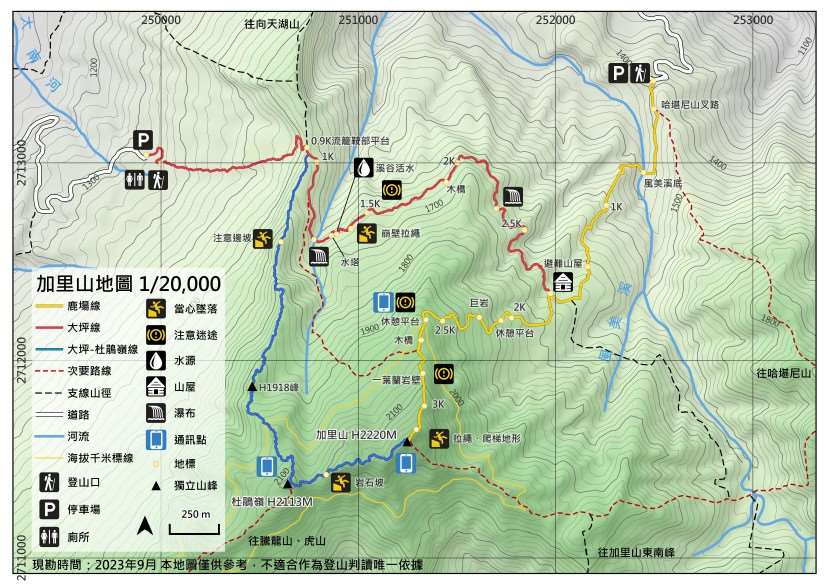 ※加里山登山步道是一條總長12.5公里的環狀中級步道,海拔範圍從1280公尺到2220公尺,高度落差達940公尺。步道以土石路、木製階梯和棧道為主,總計需約7小時30分鐘完成,適合有一定體能的登山者。