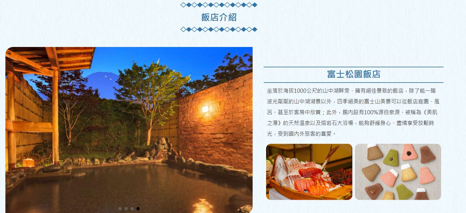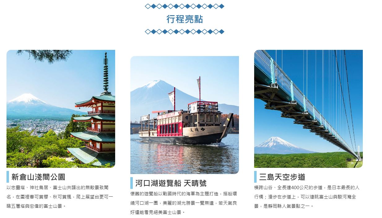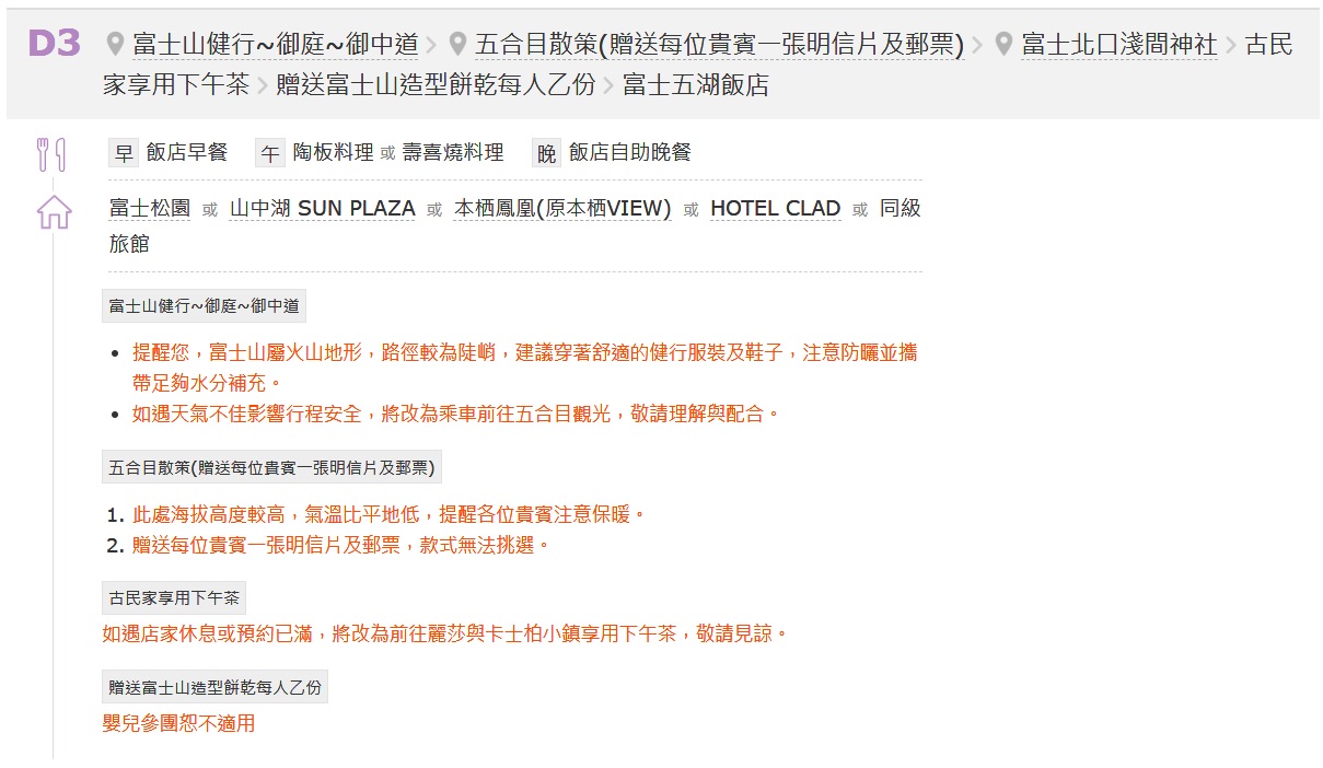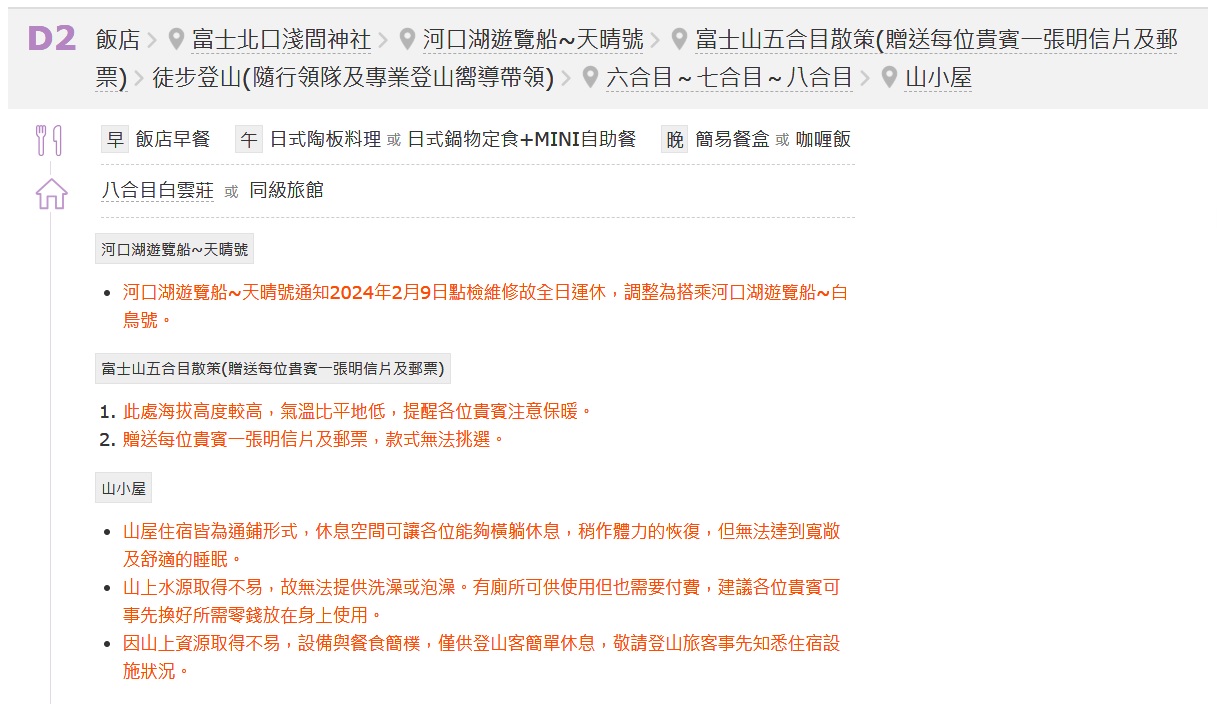 - 孕婦及患有心臟病、高血壓或其他等慢性疾病的旅客,請衡量自身狀況,請勿勉強參加具有刺激性的活動,如:水上活動、溫泉…等,避免增加身體負擔。