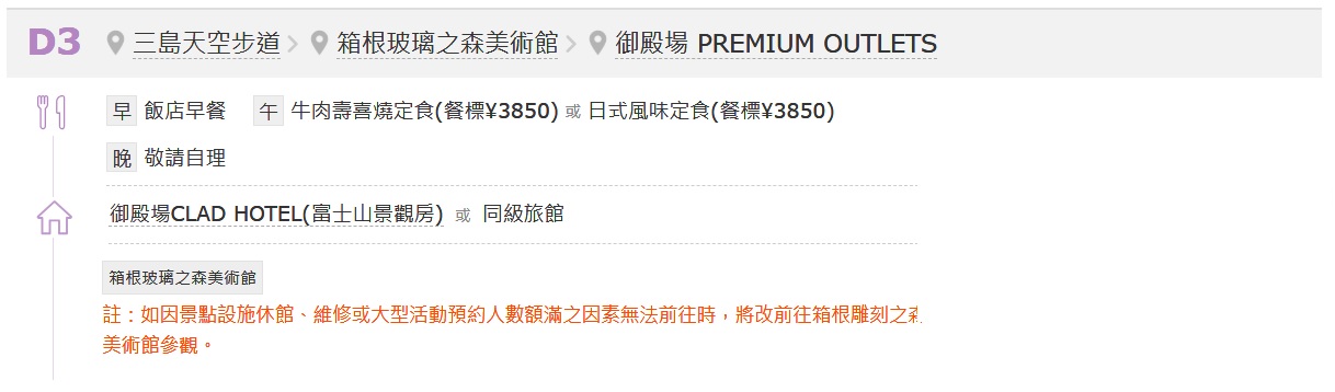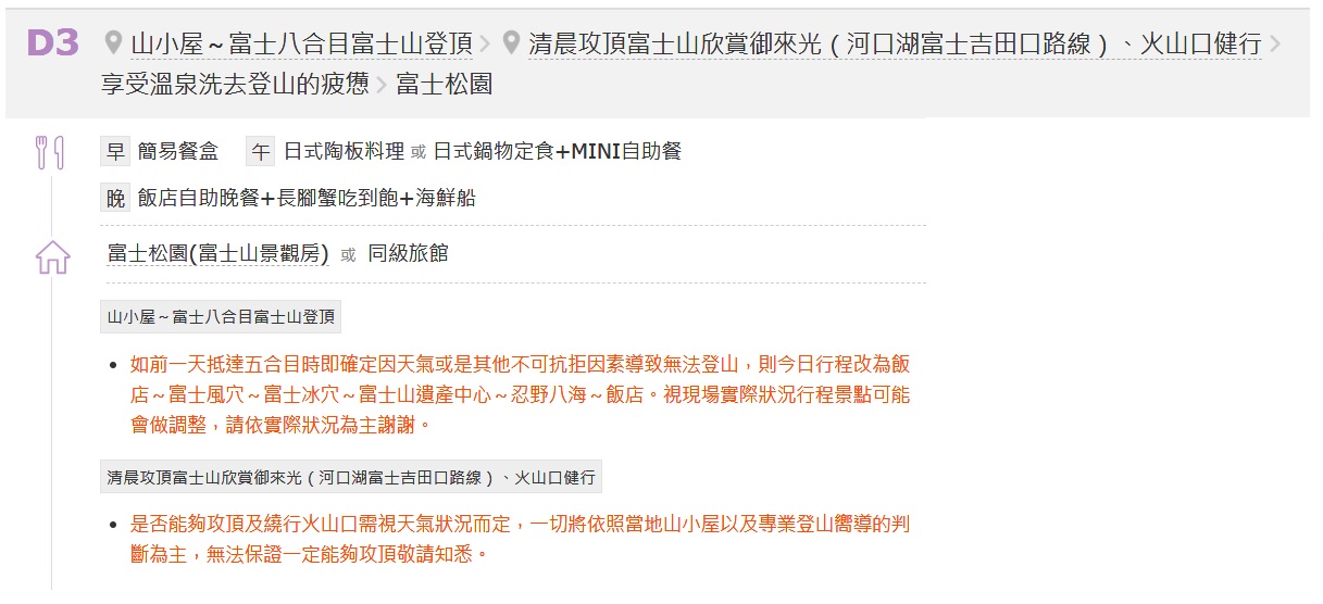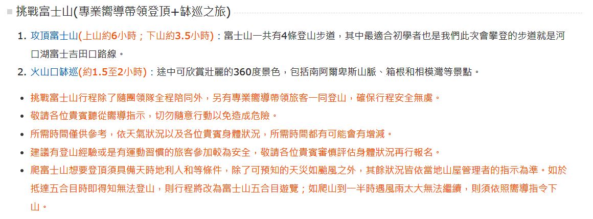 - 因本行程為團體旅遊,為確保全團旅遊品質及其他旅客的權益與安全,若您有行動不便的情況(如坐輪椅、拄拐杖或其他行走困難的情形),則請勿報名此團體旅遊。若在未告知的情況下報名,經本公司發現後,本公司仍有權取消您的參團資格,並要求您賠償因取消所生之費用。不便之處,敬請見諒。