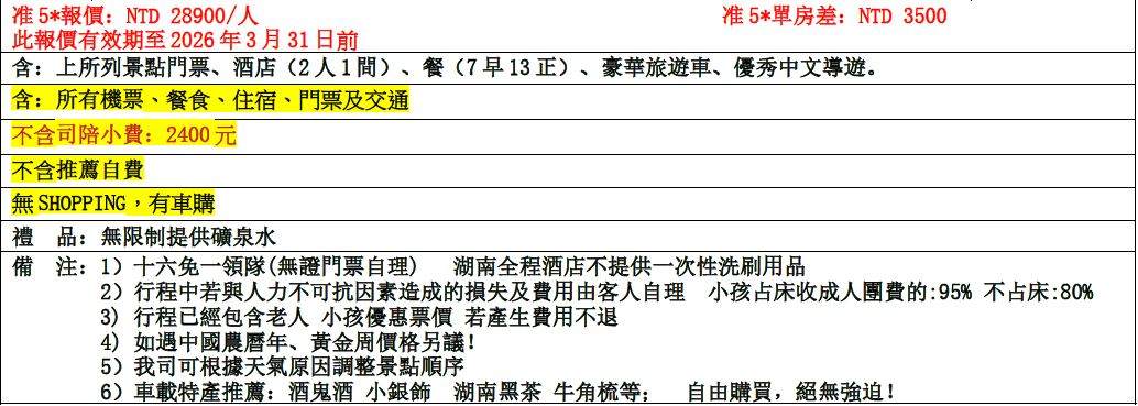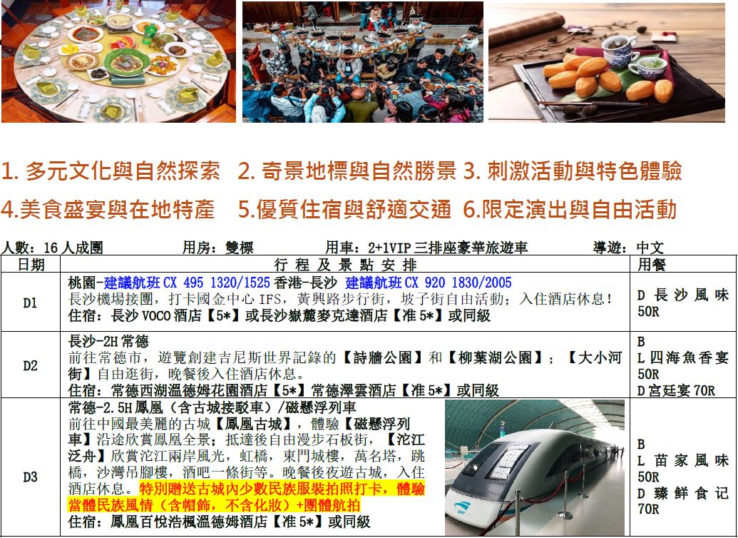 •中國地區烹飪方法與口味與台灣落差甚大,會提醒各餐廳及帶團導遊交代少油少鹽,若口味仍偏重,再煩請與領隊/導遊協助,以儘量符合台灣團體的餐食口味。