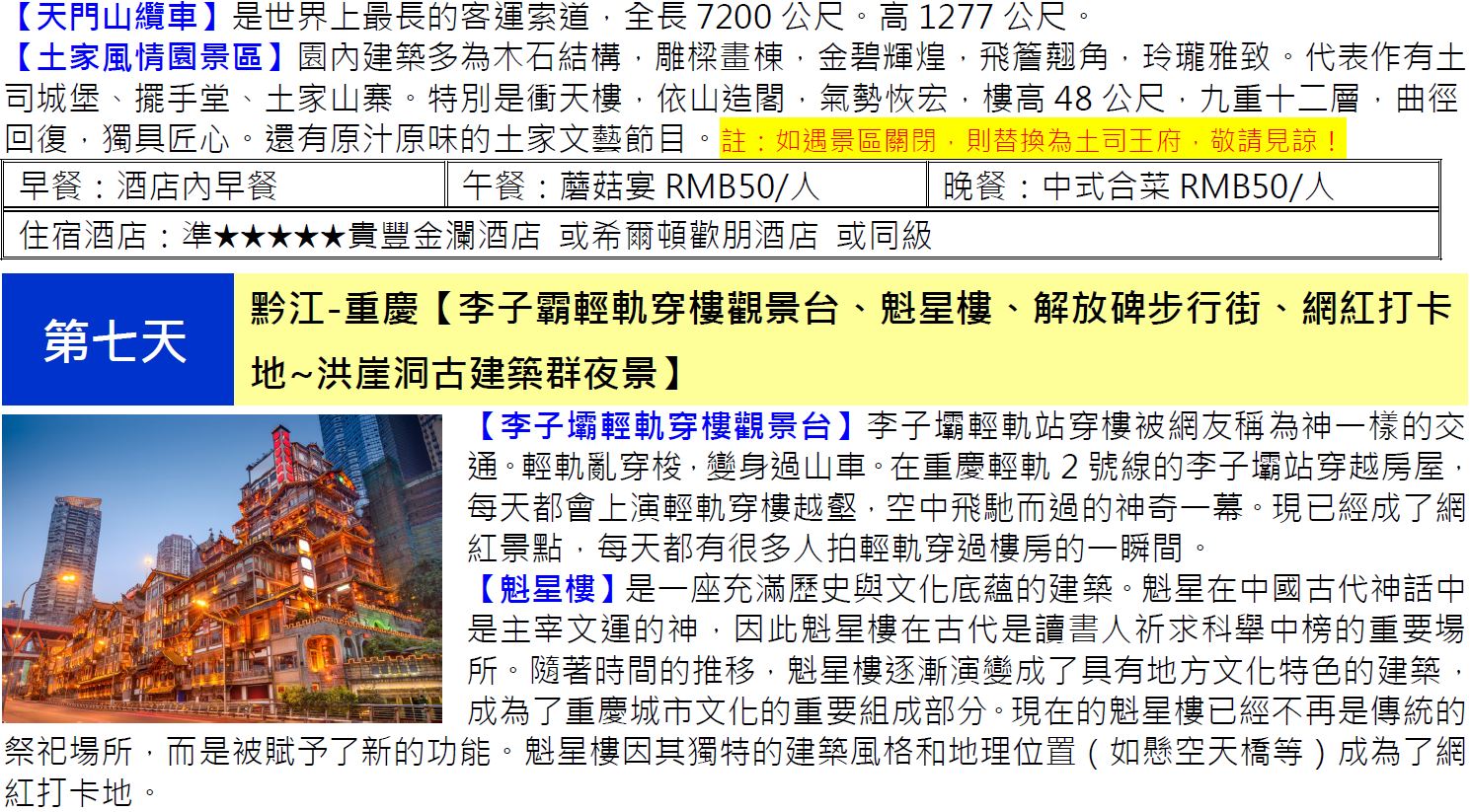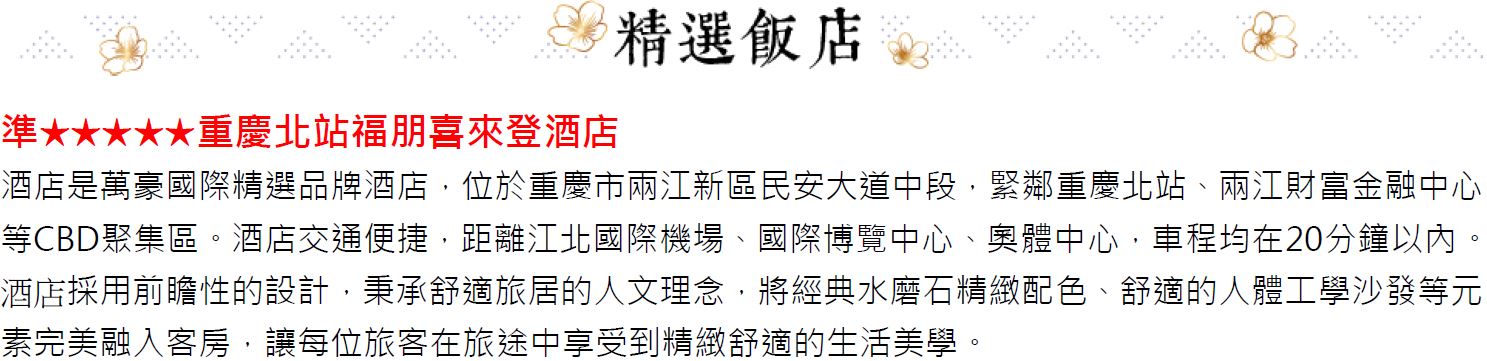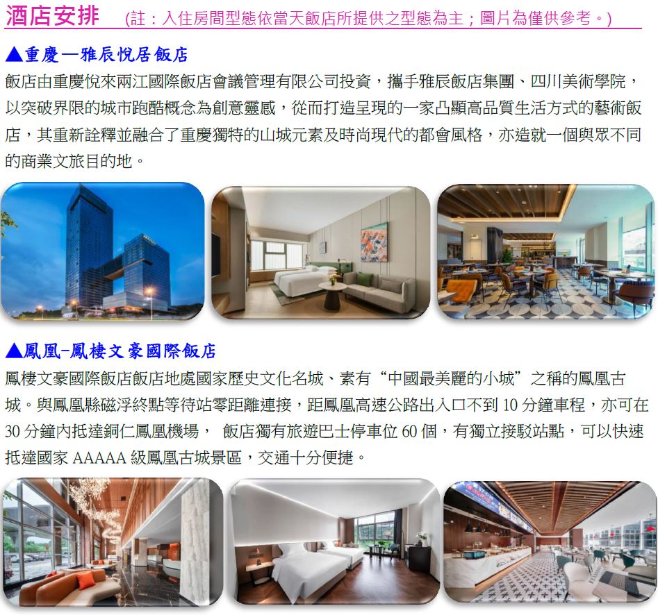 •為維護旅遊品質及貴賓們的權益,在不變更行程內容之前提下,將依正式取得飯店飯店的結果,再綜合當地實際交通等情況,為貴賓們斟酌調整並妥善安排旅遊行程、飯店入住之先後順序或旅遊路線,請以行前說明會或最後確認的行程說明資料為準。