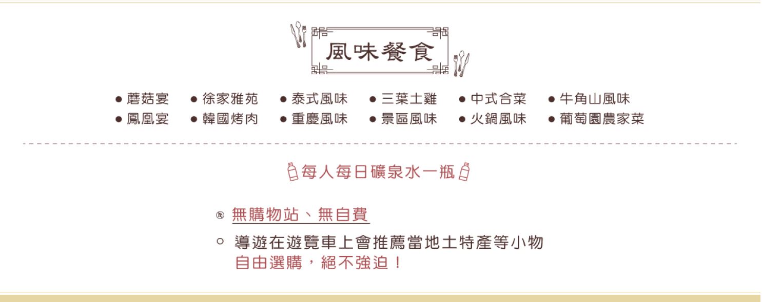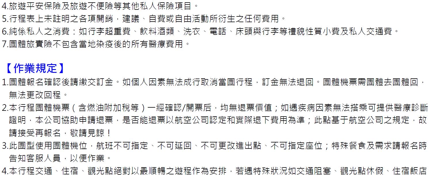※行程規定•貼心提醒: 旅客若於旅遊中因法定傳染病原因,所增加之住宿、餐食、交通費用由旅客自行負擔,建議旅客若有疑慮可自行洽詢保險公司購買旅遊平安保險。
