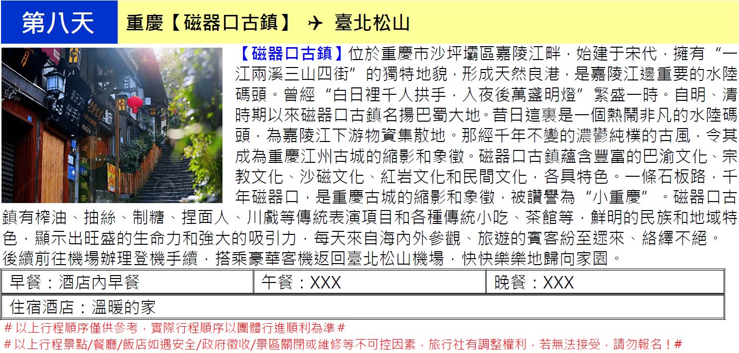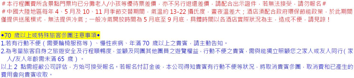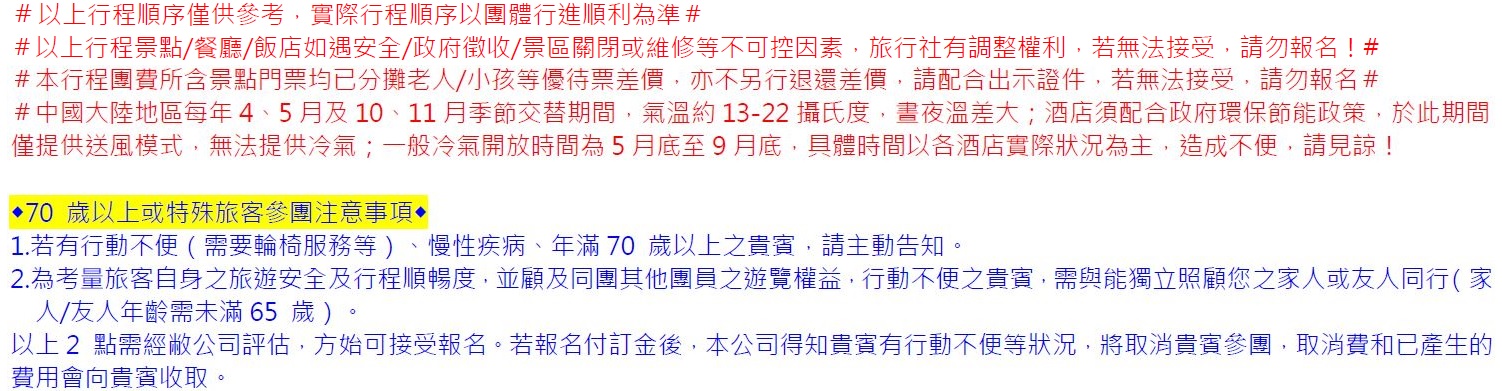 •此行程為團體旅遊行程,顧及旅客於出遊期間之人身安全及相關問題需與團體同進出。