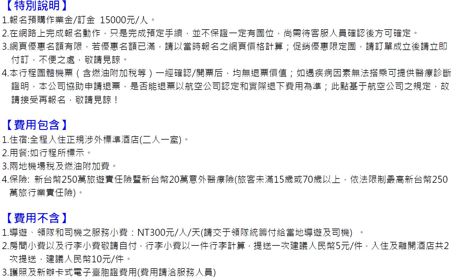 •領隊、導遊及司機服務小費總計新台幣300元台幣x天數。服務小費是由各位貴賓給予領隊、導遊、司機等人員之肯定與鼓勵,感謝您的嘉許。
