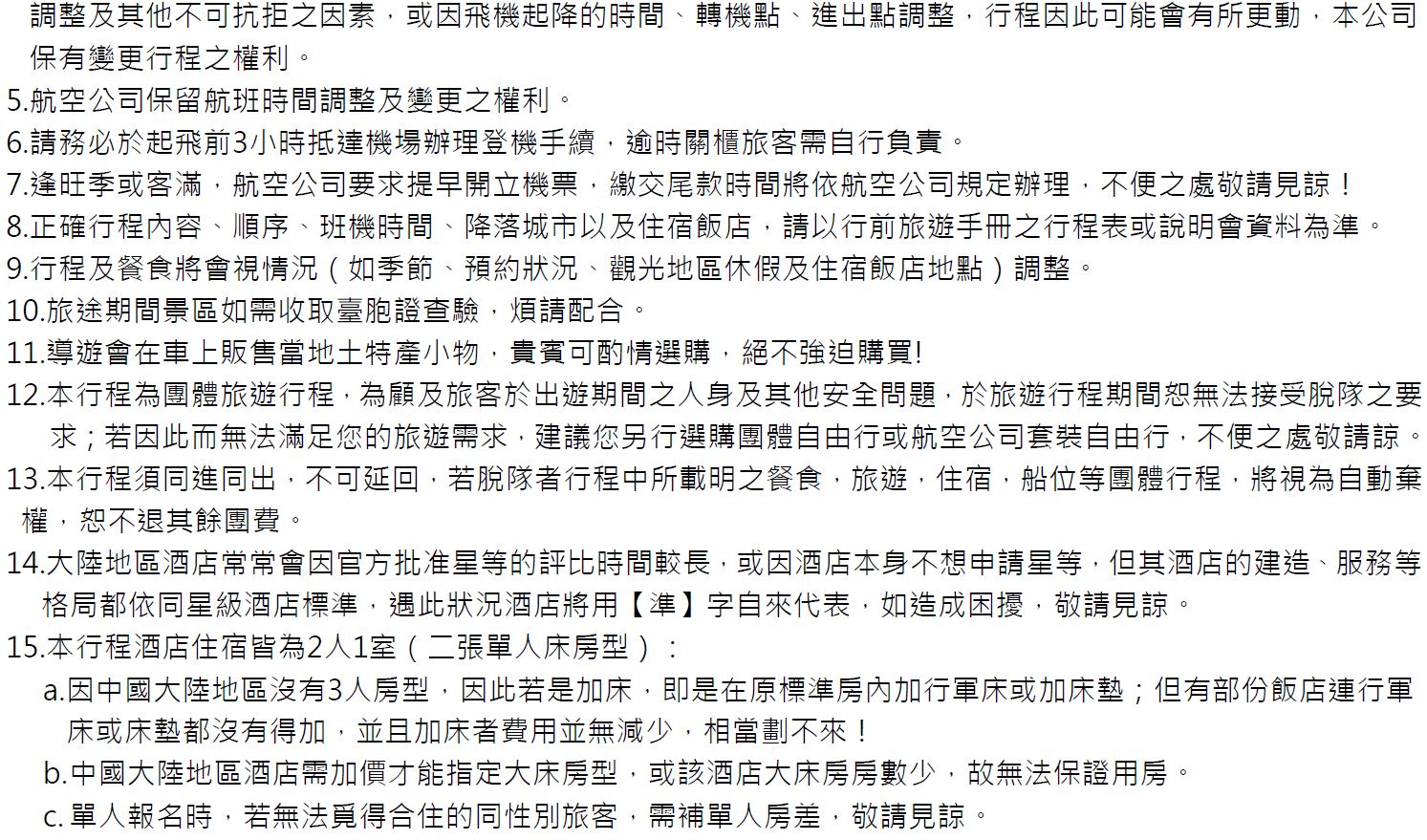 •為顧及旅客人身安全與相關問題,在旅遊行程期間恕無法接受脫隊要求。