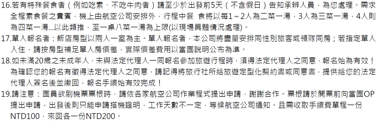 •特殊餐食:報名付訂金時請一併告之特殊餐食 例如:全程素食或不吃牛肉或其它餐食及分房表