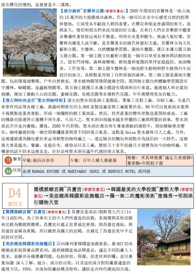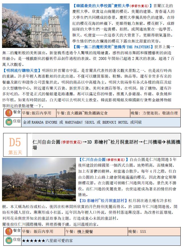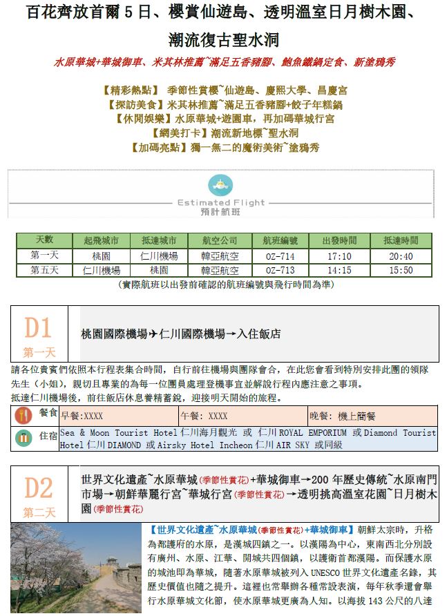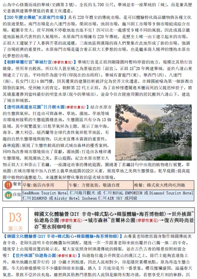 🌳第一天:桃園機場 ✈ 仁川國際機場→入住飯店 📍 第二天:飯店→世界文化遺產~水原華城(季節性賞花)+華城御車→200年歷史傳統~水原南門市場→朝鮮華麗行宮~華城行宮(季節性賞花)→透明挑高溫室花園~日月樹木園(季節性賞花) 🌄第三天:飯店→韓國文化體驗營(DIY辛奇+韓式點心+韓服體驗+海苔博物館)→世外桃源~仙遊島公園(季節性賞花)→城市森林~首爾林公園(季節性賞花))→復古與時尚並存~聖水洞咖啡街 🌼第四天:飯店→簡樸雅緻宮闕~昌慶宮(季節性賞花)→韓國最美的大學校園~慶熙大學(季節性賞花)→美妝潮流韓國彩妝旗艦店→獨一無二的魔術美術~塗鴉秀→明洞流行購物天堂 🌿第五天:飯店→仁川自由公園(季節性賞花)→3D彩繪村~松月洞童話村→仁川機場 ✈ 桃園機場 |