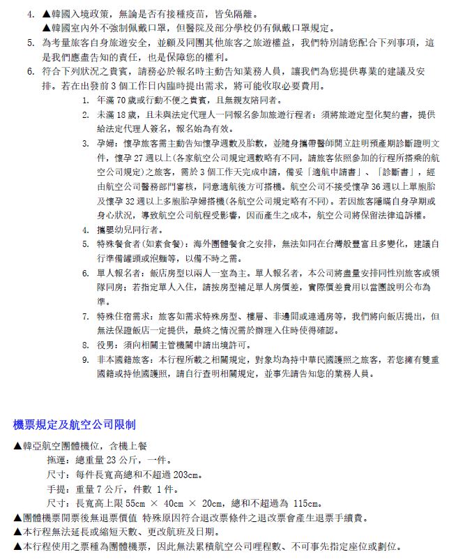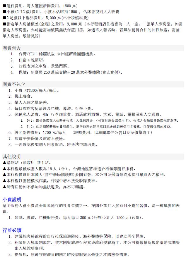 ※費用不含:代辦證件、每人服務費300元X天,非表定餐食,本行程中的額外項目支出、自費行程、房間服務費、飲料、酒水、行李小費、床頭小費電話費等個人支出、不含指定購買商務艙費用、不含單人房差須另行加外報價。 ※團費內含:行程表定住宿、餐食、交通、旅責險、門票。 |