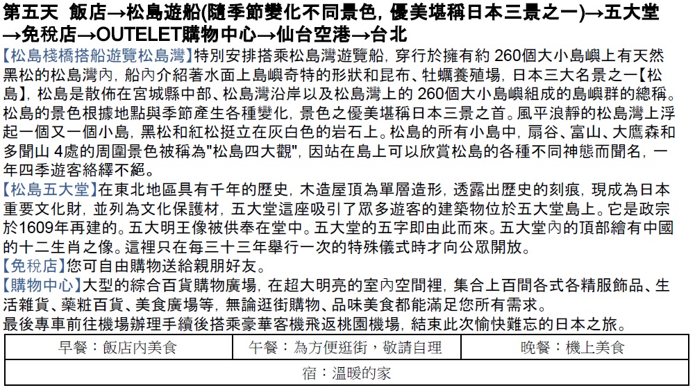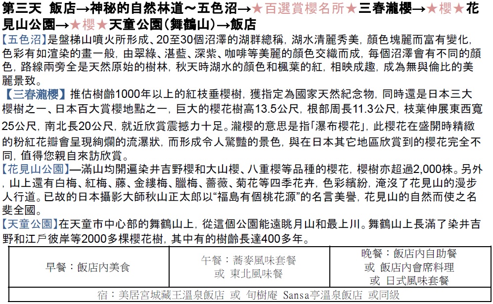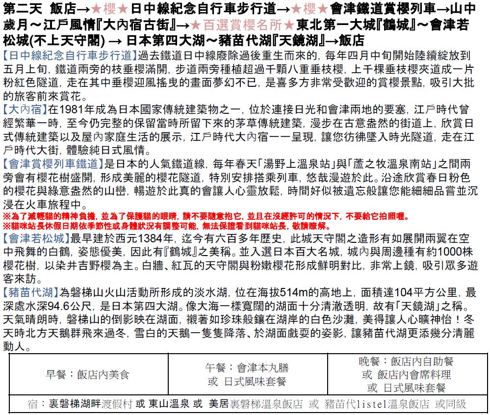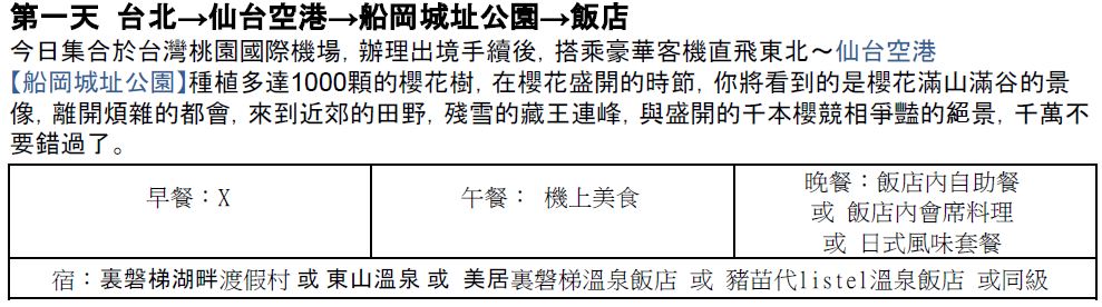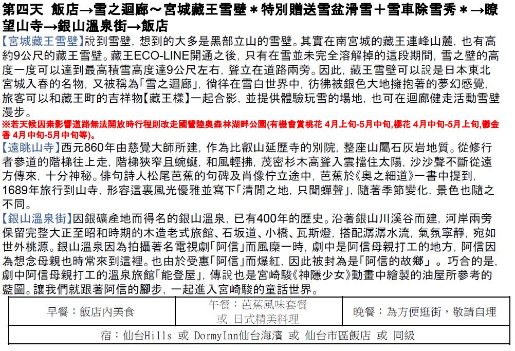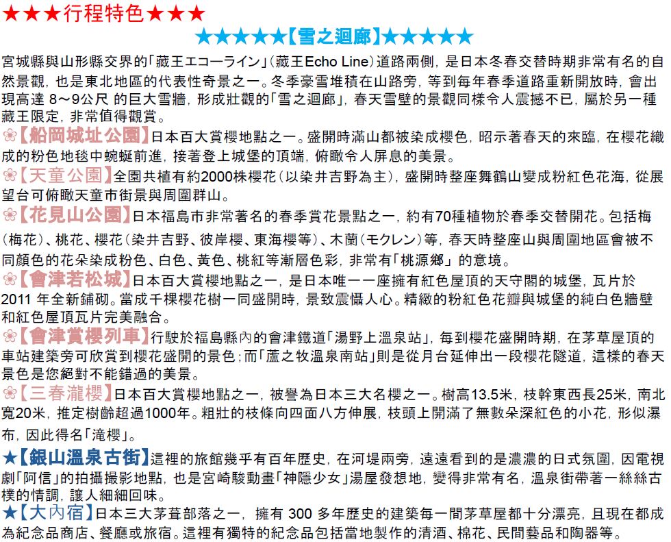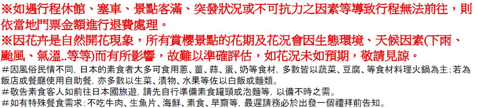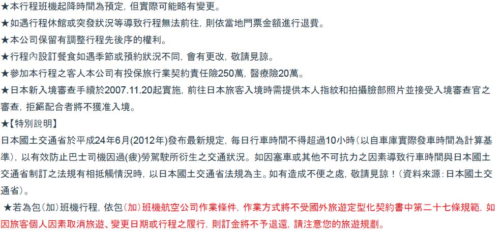 - 行程班機時間及降落城市與住宿飯店之確認以說明會資料為主。