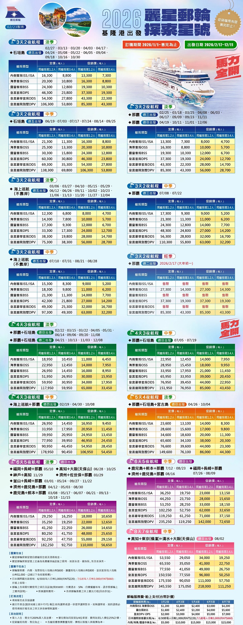 3.限時的艙房優惠+第3.4人優惠已攤算於每人房費,請您安心下訂。